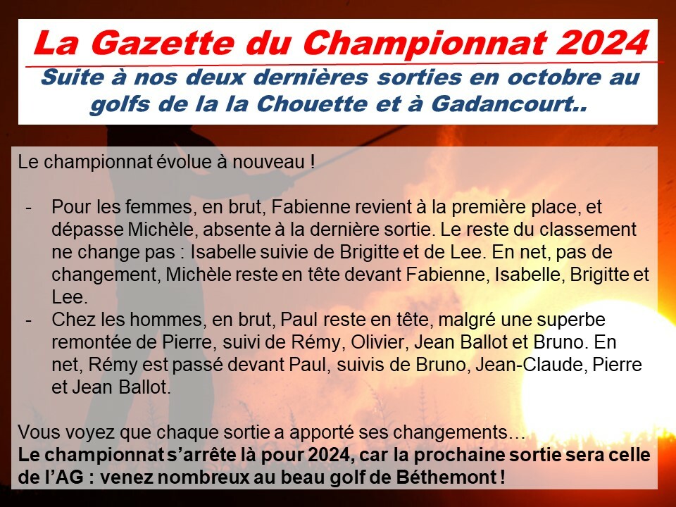 Résultat final du championnat Loisir 2024 après nos dernières sorties à La Chouette et à Gadancourt, avant l'AG à Béthemont